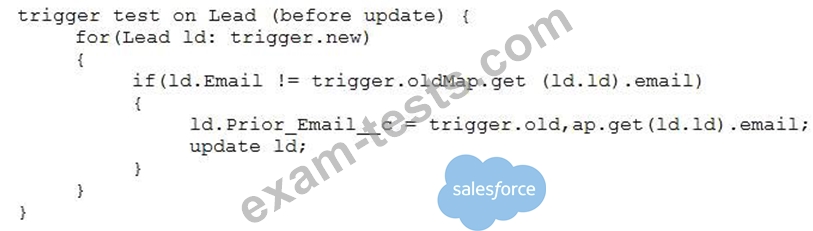 A lead object has a custom field Prior_Email__c. The following trigger is intended to copy the current Email into the Prior_Email__c field any time the Email field is changed: