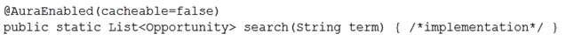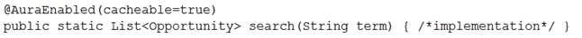 A Lightning component has a wired property, searchResults, that stores a list of Opportunities.