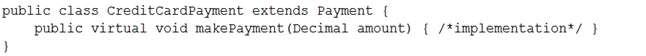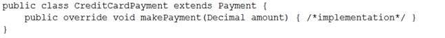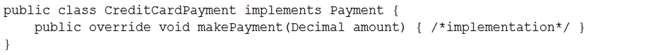 A developer must create a CreditCardPaymentclass that provides an implementation of an existing Paymentclass.