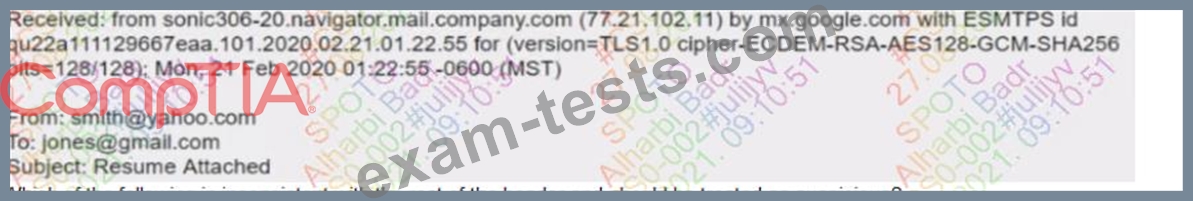 A security analyst inspects the header of an email that is presumed to be malicious and sees the following: