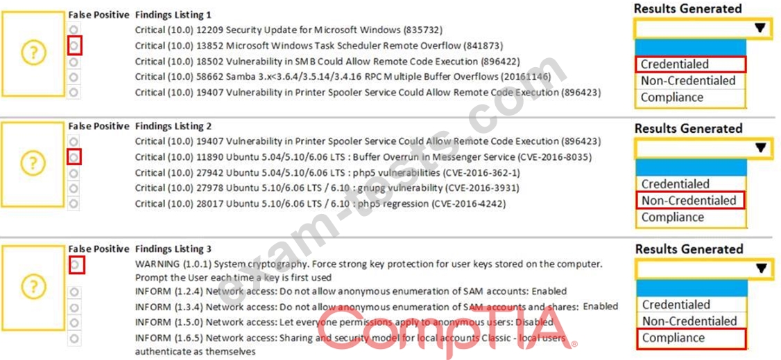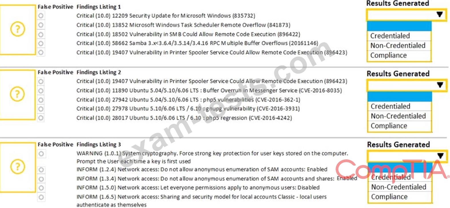 A security analyst performs various types of vulnerability scans. Review the vulnerability scan results to determine the type of scan that was executed and if a false positive occurred for each device.