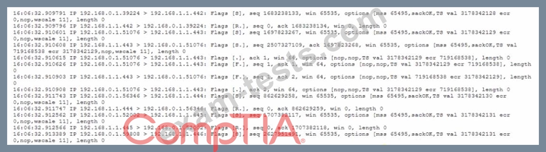 A security analyst is reviewing the output of tcpdump to analyze the type of activity on a packet capture: