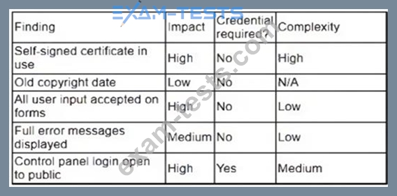 A security analyst obtained the following table of results from a recent vulnerability assessment that was conducted against a single web server in the environment: