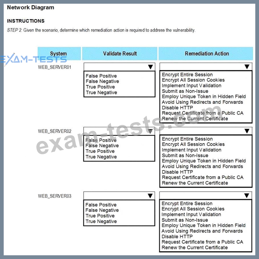After reviewing the information provided in the network diagram, select the STEP 2 tab to complete the simulation by selecting the correct Validation Result and Remediation Action for each server listed using the drop-down options.