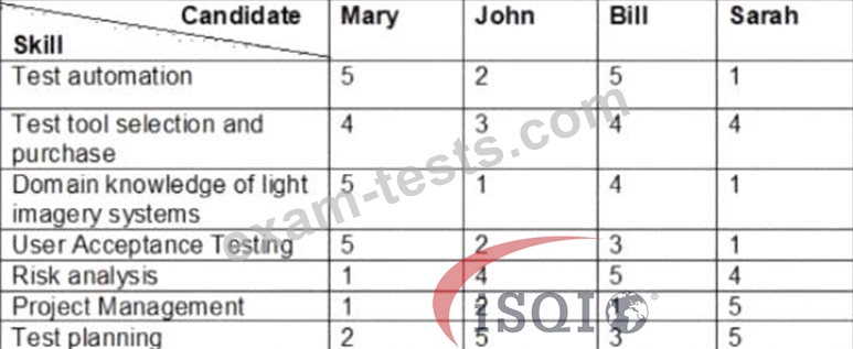 RISK1 Working prototypes will be delivered late to the integration test environments RISK 2 A delay in signing the contract with 'Silver Sound Ltd' will impact the programme schedule RISK 3 Inexperience in testing light imagery software will cause major defects to be missed RISK 4 The user interface software for the sound systems will be delivered late into testing Refer to SCENARIO 2 - The IT Director for 'Safe as Houses' is recruiting a Programme Test Manager and has been provided with a skills matrix for four prospective candidates. The matrix shows the skill level (5 being highest. 1 lowest) for each candidate: