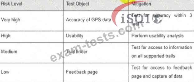 You are managing the test team that is testing a new mobile application that provides a "step-by-step' hiking guide Your risk assessment resulted in the following table: