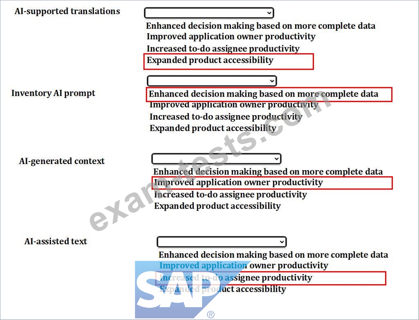 Enforce compliance: "With SAP AI-powered governance, compliance, and risk management solutions, finance departments can identify and respond to risks as they arise."learning.sap.com "Optimize working capital, manage risk, ensure compliance, and grow revenue."sap.com Guard against fraud: "AI-assisted anomaly detection to protect the business against fraud."learning.sap.com "Reduce revenue losses due to fraud using AI with SAP Business Integrity Screening for SAP S/4HANA Cloud Private Edition."sap.com Simplify error resolution: "Intelligent guidance to simplify error resolution."learning.sap.com "Eliminate manual payment clarifications, reducing accounts receivable matching effort by 71% with AI-powered matching and payment advice extraction."sap.com Other options are incorrect because: