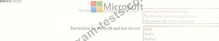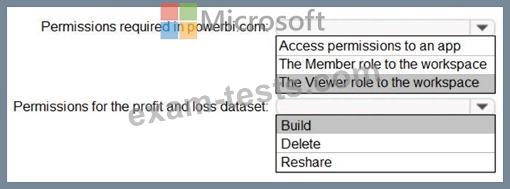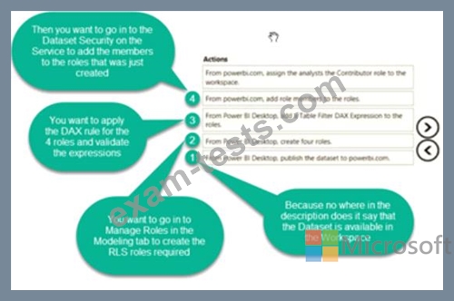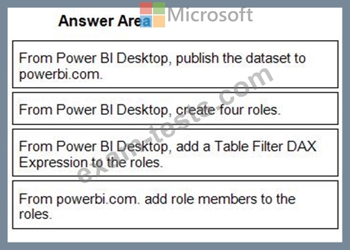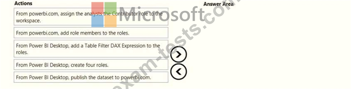 Once the profit and loss dataset is created, which four actions should you perform in sequence to ensure that the business unit analysts see the appropriate profit and loss data? To answer, move the appropriate actions from the list of actions to the answer area and arrange them in the correct order.