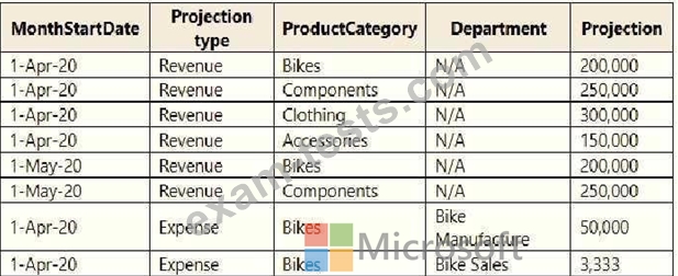 Monthly revenue and expense projections for the next quarter come from a Microsoft SharePoint Online list. Quarterly projections relate to the profit and loss results by using the following shared dimensions: date, business unit, department, and product category.