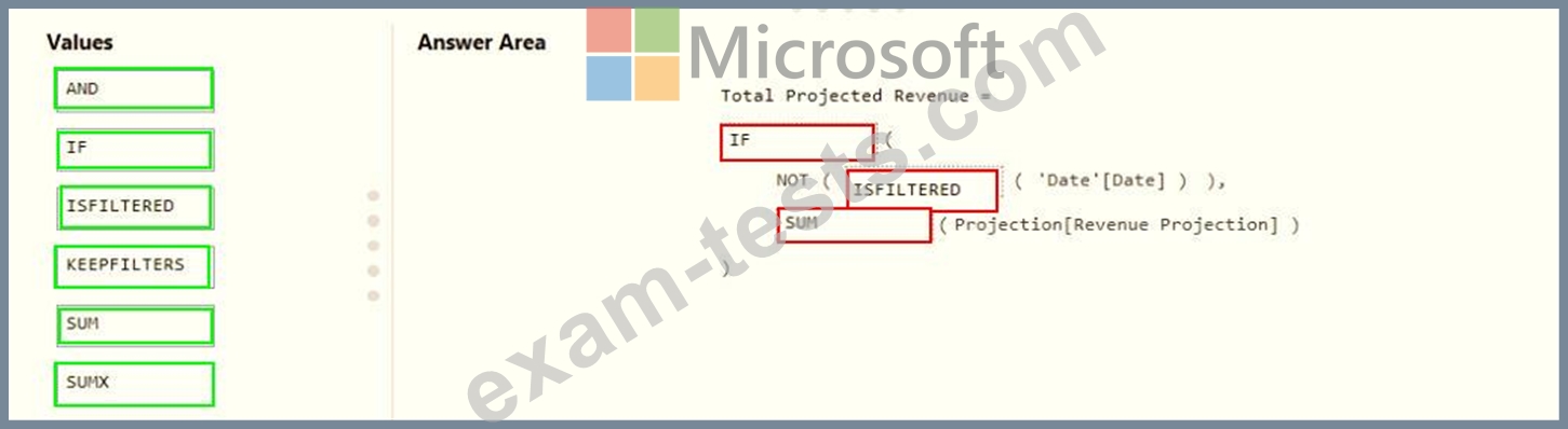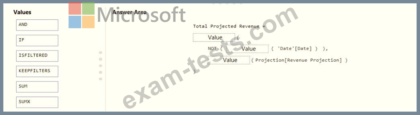 How should you complete the measure? To answer, drag the appropriate values to the correct targets. Each value may be used once, more than once, or not at all. You may need to drag the split bar between panes or scroll to view content.