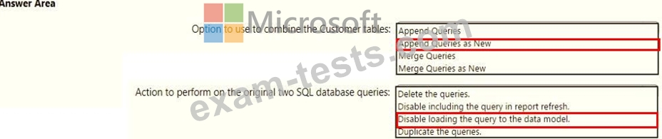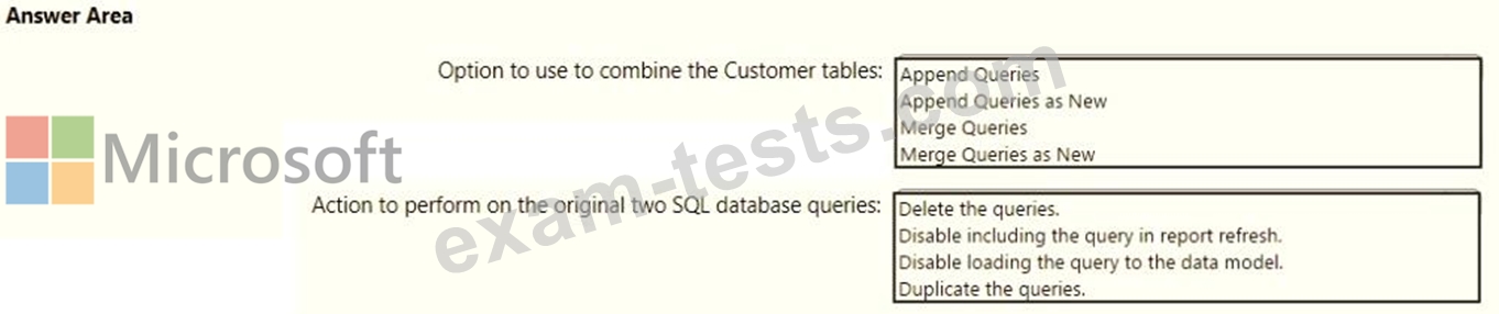 You need to combine the Customer tables into a single table. The solution must minimize the size of the data model and support scheduled refresh in powerbi.com.