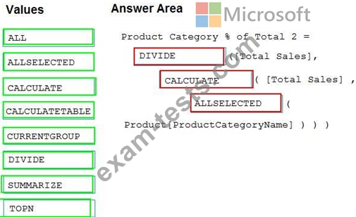 You need to write a calculation that returns the percentage of total sales that a selected ProductCategoryName value represents. The calculation must respect any slicers on ProductCategoryName and must show the percentage of visible total sales. For example, if there are four ProductCategoryName values, and a user filters one out, a table showing ProductCategoryName and the calculation must sum up to 100 percent.