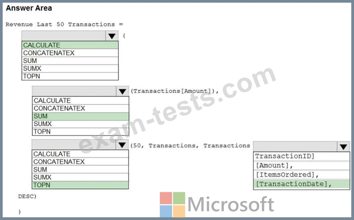 How should you complete the DAX expression? To answer, select the appropriate options in the answer area.
