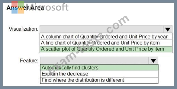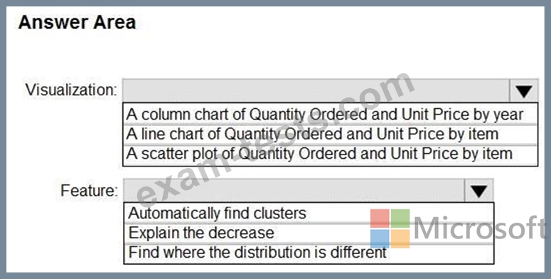 Which type of visualization and which feature should you use? To answer, select the appropriate options in the answer area.
