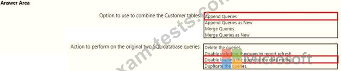 You need to combine the Customer tables into a single table. The solution must minimize the size of the data model and support scheduled refresh in powerbi.com.