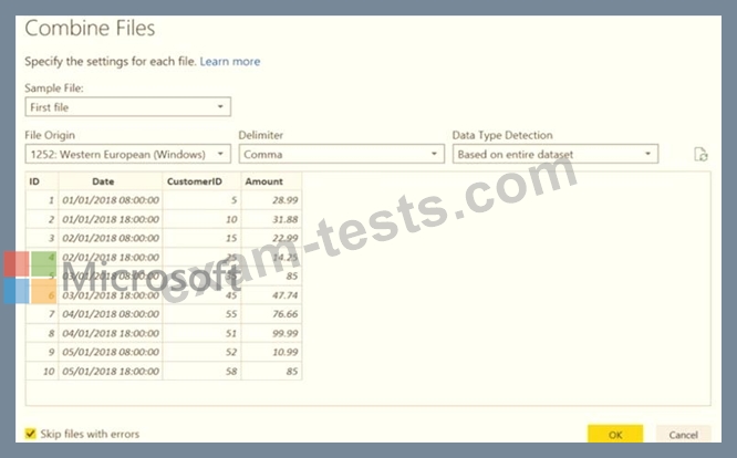 You receive the following email message: "Hi. I've put 24 files of monthly transaction data onto the shared drive. File Transactions201901.csv through Transactions201912.csv have the latest set of columns, but files Transactions201801.csv to Transactions201812.csv have an older layout without the extra fields needed for analysis. Each file contains 10 to 50 transactions." You get data from the folder and select Combine & Load. The Combine Files dialog box is shown in the exhibit. (Click the Exhibit tab.)