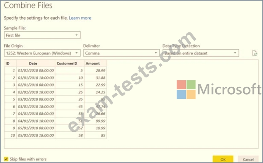 You receive the following email message: "Hi. I've put 24 files of monthly transaction data onto the shared drive. File Transactions201901.csv through Transactions201912.csv have the latest set of columns, but files Transactions201801.csv to Transactions201812.csv have an older layout without the extra fields needed for analysis. Each file contains 10 to 50 transactions." You get data from the folder and select Combine & Load. The Combine Files dialog box is shown in the exhibit. (Click the Exhibit tab.)