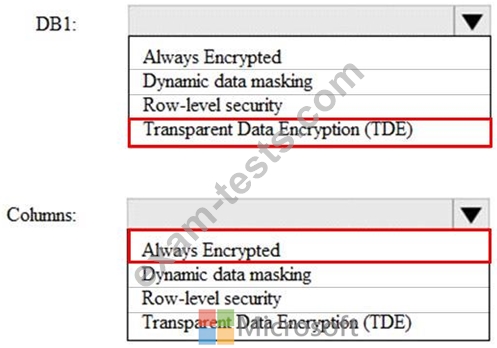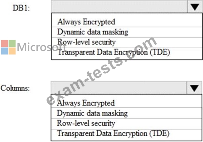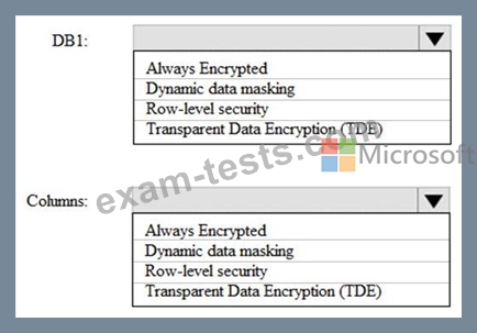 * Ensures that data from the columns containing PII data is encrypted in transit Which security solution should you recommend for DB1 and the columns? To answer, select the appropriate options in the answer area.