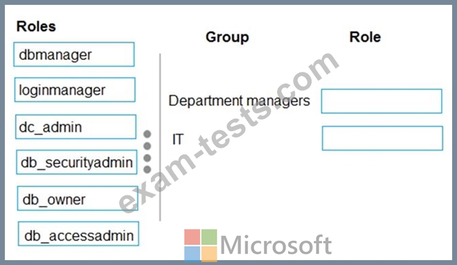 Which role memberships should you recommend? To answer, drag the appropriate roles to the correct groups. Each role may be used once, more than once, or not at all. You may need to drag the split bar between panes or scroll to view content.