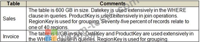 You have an on-premises data warehouse that includes the following fact tables. Both tables have the following columns: DataKey, ProductKey, RegionKey. There are 120 unique product keys and 65 unique region keys.