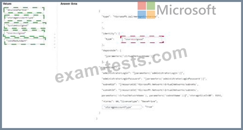 How should you complete the template? To answer, drag the appropriate values to the correct targets. Each value may be used once, more than once, or not at all. You may need to drag the split bar between panes or scroll to view content.