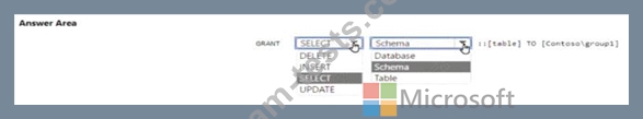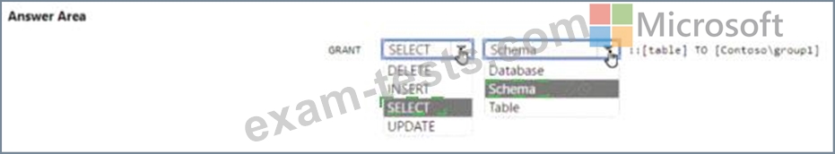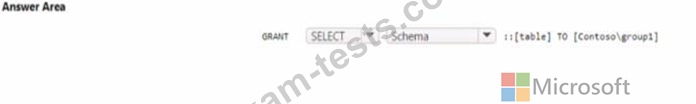 You have an Azure subscription that contains a group named Group1 and an Azure SQL managed instance that hosts a database named 081. You need to ensure that Group 1 has read access to new tables created m 06I The solution must use the principle of least privilege How should you complete the Transact-SQL statement' To answer, select the appropriate options in the answer area. NOTE: Each correct selection is worth one point.