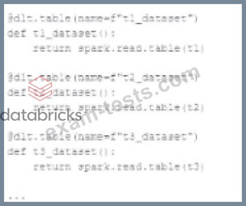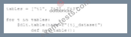 A data engineer wants to reflector the following DLT code, which includes multiple definition with very similar code: In an attempt to programmatically create these tables using a parameterized table definition, the data engineer writes the following code. The pipeline runs an update with this refactored code, but generates a different DAG showing incorrect configuration values for tables. How can the data engineer fix this?
