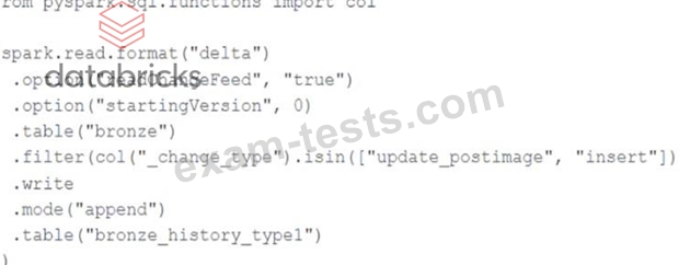 Explanation This is the correct answer because it describes the execution and results of running the above query multiple times. The query uses the readChanges function to read all change events from a bronze table that has enabled change data feed. The readChanges function takes two arguments: version and options. The version argument specifies which version of the table to read changes from, and can be either a specific version number or -1 to indicate all versions. The options argument specifies additional options for reading changes, such as whether to include deletes or not. In this case, the query reads all changes from all versions of the bronze table and filters out delete events by setting includeDeletes to false. Then, it uses write.format("delta").mode("overwrite") to overwrite a target table using the entire history of inserted or updated records, giving the desired result of a Type 1 table representing all values that have ever been valid for all rows in the bronze table. Verified References: [Databricks Certified Data Engineer Professional], under "Delta Lake" section; Databricks Documentation, under "Read changes in batch queries" section.