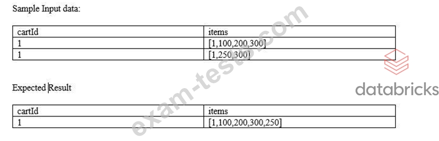 Below sample input data contains two columns, one cartId also known as session id, and the second column is called items, every time a customer makes a change to the cart this is stored as an array in the table, the Marketing team asked you to create a unique list of item's that were ever added to the cart by each customer, fill in blanks by choosing the appropriate array function so the query produces below expected result as shown below.