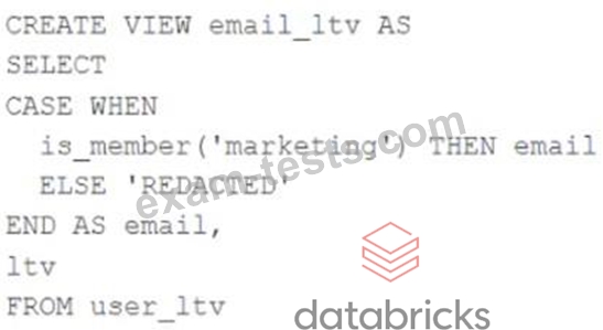 A table named user_ltv is being used to create a view that will be used by data analysts on various teams. Users in the workspace are configured into groups, which are used for setting up data access using ACLs.