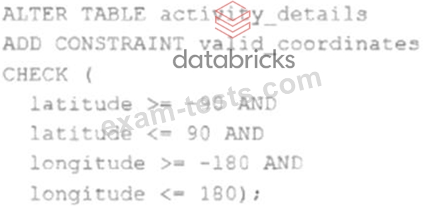 The downstream consumers of a Delta Lake table have been complaining about data quality issues impacting performance in their applications. Specifically, they have complained that invalid latitude and longitude values in the activity_details table have been breaking their ability to use other geolocation processes.