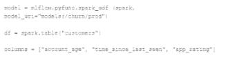 The following code correctly imports the production model, load the customer table containing the customer_id key column into a Dataframe, and defines the feature columns needed for the model.