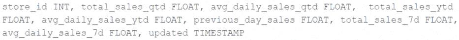 This includes total sales for the previous day alongside totals and averages for a variety of time periods. The fields required to populate this dashboard have the following schema:
