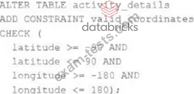 The downstream consumers of a Delta Lake table have been complaining about data quality issues impacting performance in their applications. Specifically, they have complained that invalidlatitudeandlongitudevalues in theactivity_detailstable have been breaking their ability to use other geolocation processes.