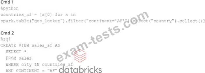 A junior member of the data engineering team is exploring the language interoperability of Databricks notebooks. The intended outcome of the below code is to register a view of all sales that occurred in countries on the continent of Africa that appear in the geo_lookup table.