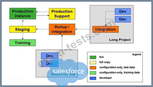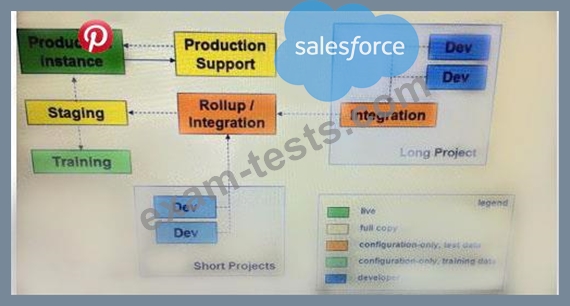 Universal Containers (UC) is working on a major project release and is using the environments depicted in the following diagram.