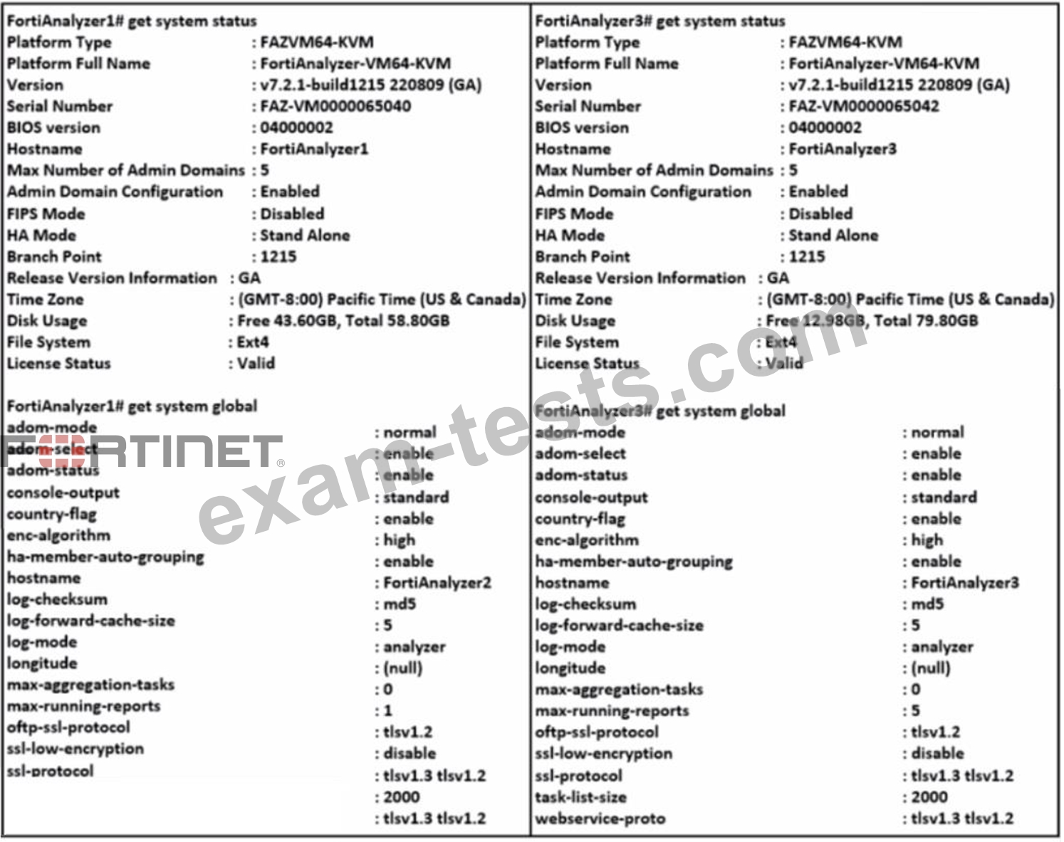 Based on the partial outputs displayed, which devices can be members of a FortiAnalyzer Fabric?