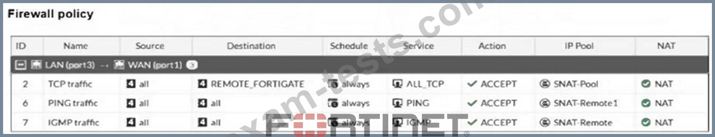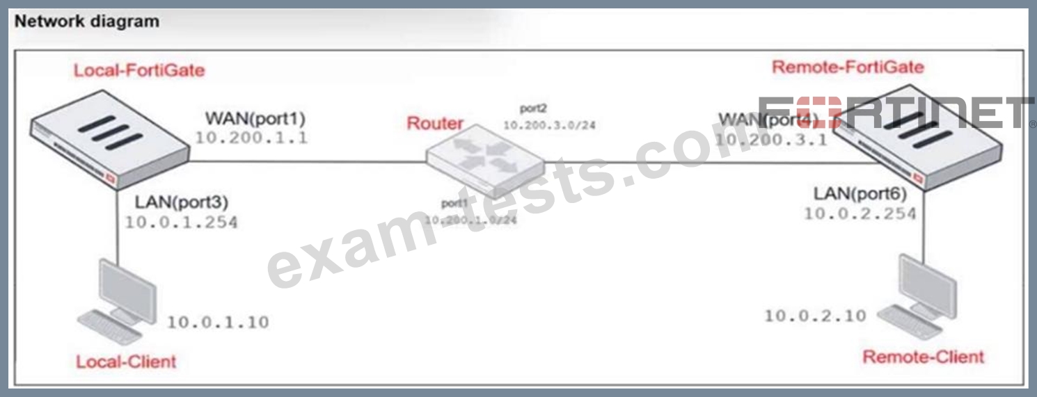 Which IP address will be used to source NAT (SNAT) the traffic, if the user on Local-Client (10.0.1.10) pings the IP address of Remote-FortiGate (10.200.3.1)?