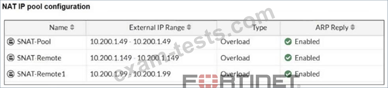 The exhibits show a diagram of a FortiGate device connected to the network, as well as the IP pool configuration and firewall policy objects.