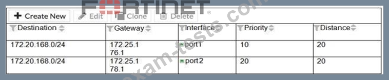 Which of the following is the expected FortiGate behavior regarding these two routes to the same destination?