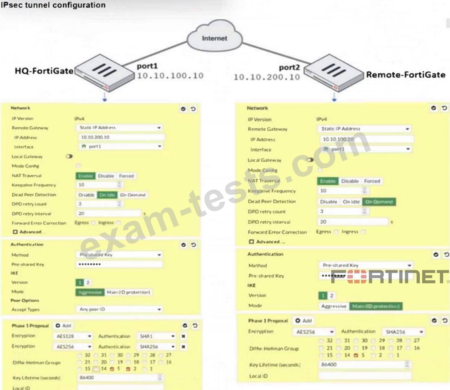 Based on the phase 1 configuration and the diagram shown in the exhibit, which two configuration changes can the administrator make to bring phase 1 up? (Choose two.)
