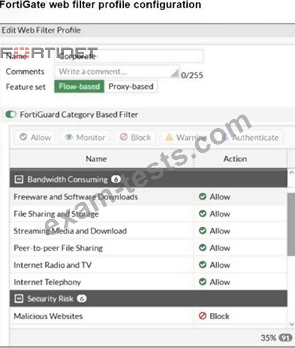 The exhibit shows the FortiGuard Category Based Filter section of a corporate web filter profile.