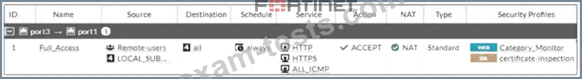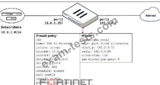 The exhibit shows a diagram of a FortiGate device connected to the network and the firewall policy and IP pool configuration on the FortiGate device.