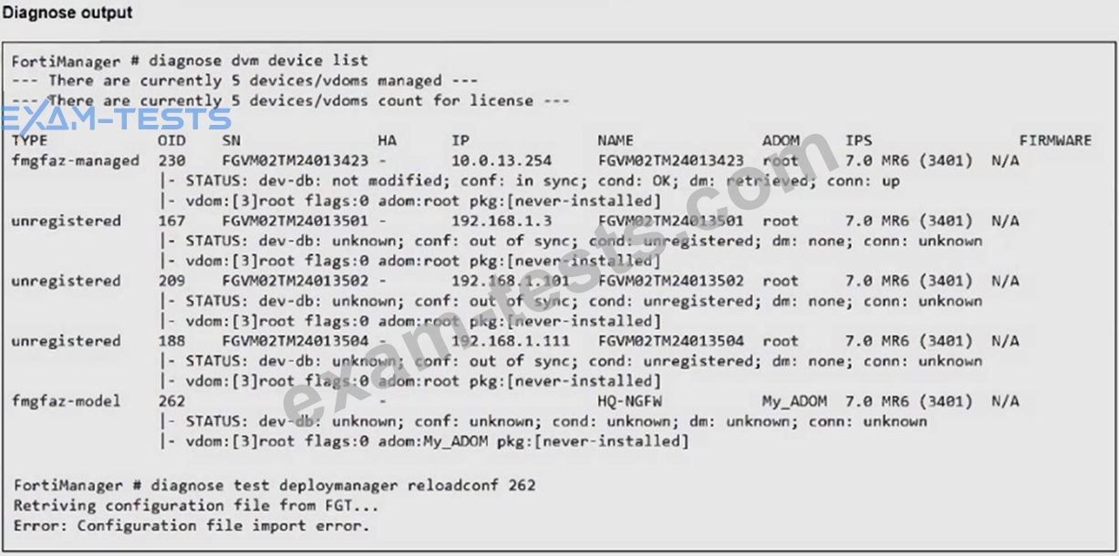 Refer to the exhibits. An administrator runs the reload failure command diagnose test deploymanager reloadconf 262 on FortiManager.