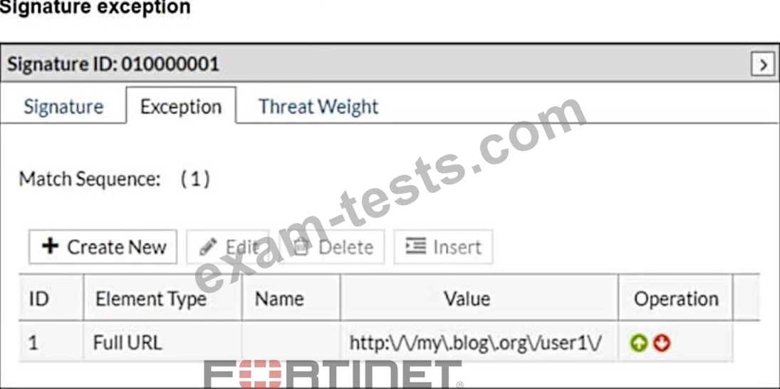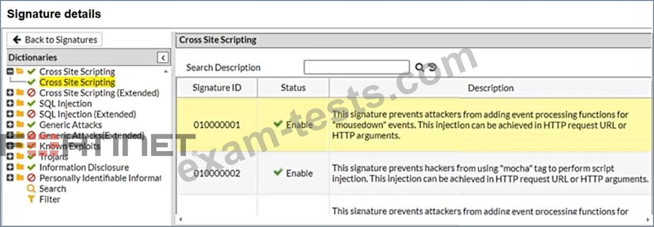What will happen when a client attempts a mousedown cross-site scripting (XSS) attack against the site http://my.blog.org/userl1/blog.php and FortiWeb is enforcing the highlighted signature?
