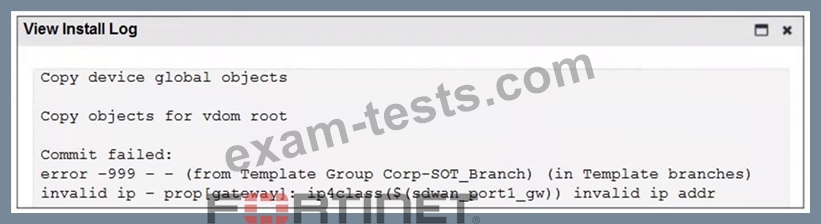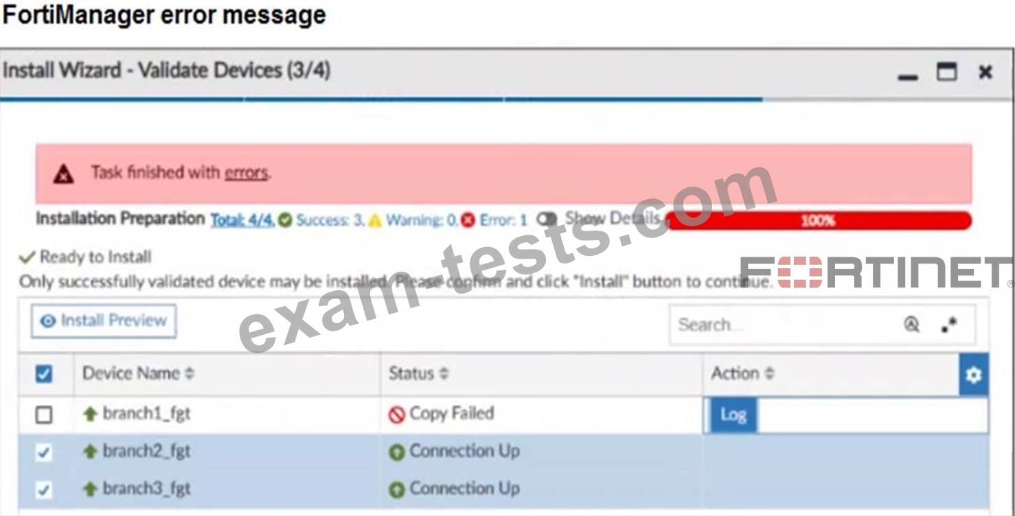 When you install the device settings. FortiManager prompts you with the error "Copy Failed" for the device branch1_fat When you click the log button. FortiManager displays the message shown in the exhibit.