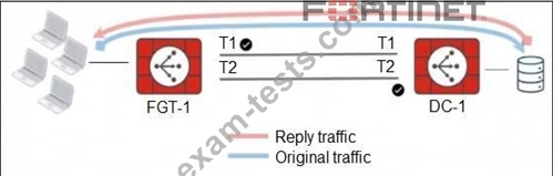 Refer to the exhibit. The administrator analyzed the traffic between a branch FortiGate and the server located in the data center, and noticed the behavior shown in the diagram. When the LAN clients located behind FGT1 establish a session to a server behind DC-1, the administrator observes that, on DC-1, the reply traffic is routed over T2. even though T1 is the preferred member in the matching SD-WAN rule.