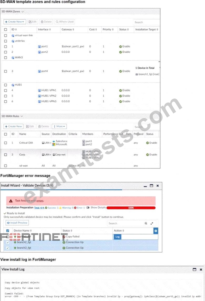 Refer to the exhibits. You use FortiManager to configure SD-WAN on three branch devices.