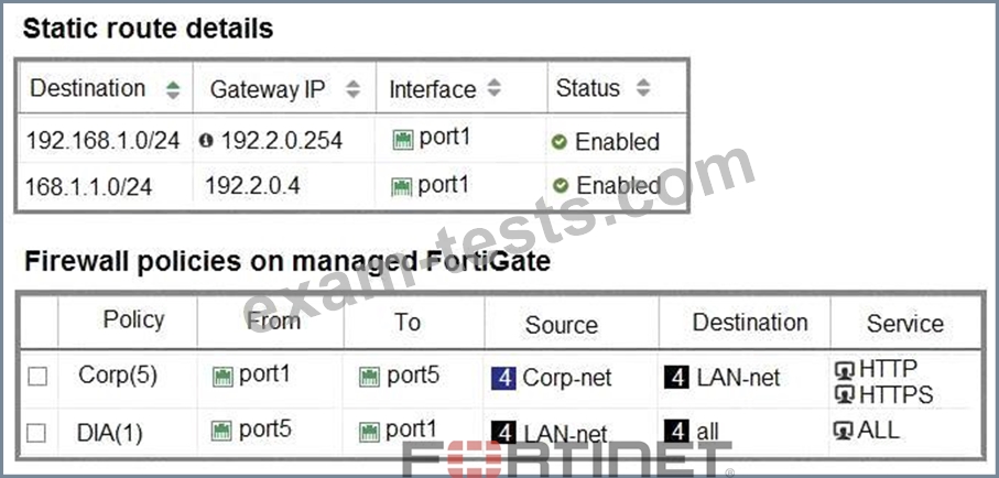 The interface details, static route configuration, and firewall policies on the managed FortiGate device are shown.