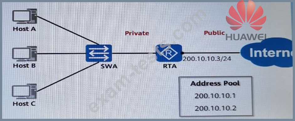 As shown in the figure, RTA uses NAT technology and realizes multiple-to-multiple NAPT address translation by defining an address pool, so that hosts in the private network can access the public network. Suppose that there are only two public IP addresses in the address pool, and they have been assigned to hosts A and B for address conversion, and if host C also wants to access the public network, which of the following description is correct?